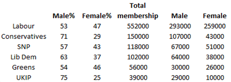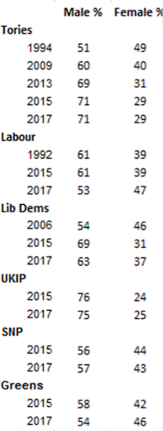 UKIP – assuming for the sake of argument that it still exists – lies at the other end of the spectrum. Men make up three quarters of its members.